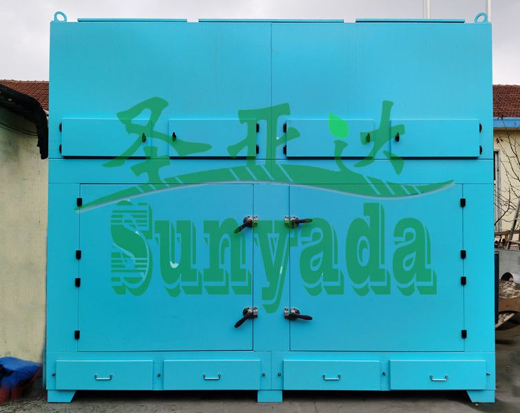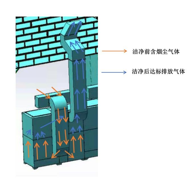 设备分为上下箱体,下箱体为进风口,进风口由管道连接,风由上方管道进入下箱体,上箱体为出风口,反吹设计,由风机吸进后再由烟囱排出。上下衔接后不再分开,由螺栓固定。检修时由上箱体的小门进行气包检修。
