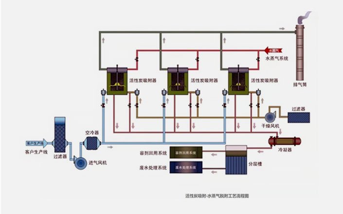 本工艺采用溶剂回收专用流活性炭吸附。吸附在低温常压下进行,脱附采用间接加热结合真空的工艺,系统设置二太吸附床,即一床吸附,一床脱附,交替使用。吸附床吸附饱和后,并将脱附出来的有机气体携带出吸附床,蒸汽进入吸附床内,对流活性炭进行间接加热,同时真空泵对吸附床进行抽真空。吸咐床出来的气体经冷凝后,液体进入贮槽,不凝气回流至吸附床进一步吸附。